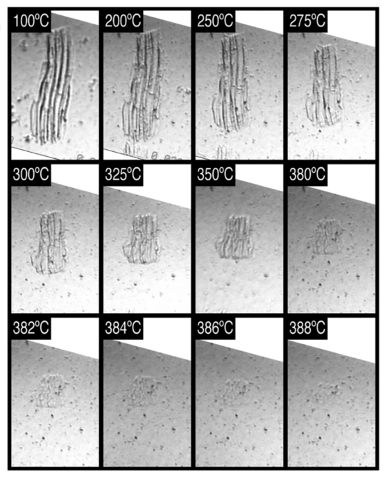 几丁质有很好的耐热性,在烹煮中几乎不会改变结构,因此蘑菇的口感也能够保持稳定。在一项研究里,科学家在25 MPa的恒定高压下,对金针菇进行加热,并用光学显微镜观察菌丝在不同温度下的形态。从室温加热到大约200°C时,菌丝基本保持不变;如果继续升温,长长的菌丝会急剧收缩,但它们的宽度没有变化;到了380°C-390°C,由于几丁质完全分解,菌丝才会最终溶解消失——一般我们做菜时的温度和压强,并不足以让蘑菇产生这么大的变化。