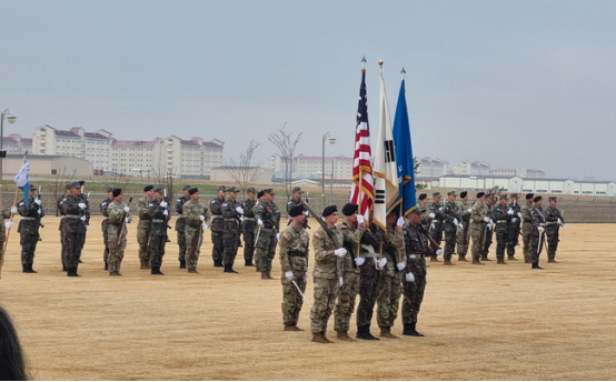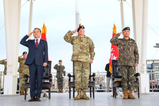 当地时间15日,在平泽汉弗莱兵营举行“韩美联军司令部部队迁址及创建第44周年纪念仪式”。 图自韩媒