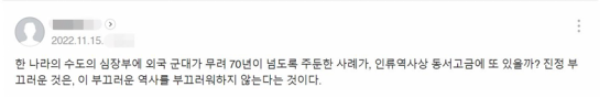 还有人对驻韩美军基地持反对立场,写道:“外国军队在一个国家首都的中心地带驻军超过70年,请问这种事情古今中外还会再有吗?最让人感到羞愧的是,有人对这种令人蒙羞的历史一点都不感到羞愧!”↓