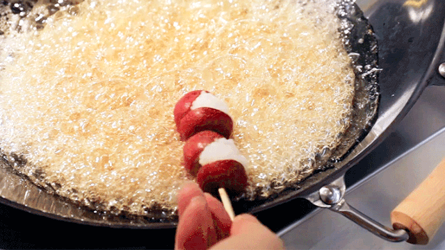 所谓“冰糖”,是把白砂糖和水以一定比例烧热之后,裹在食物上遇冷凝固形成的结晶体。最早的冰糖葫芦可以追溯到公元1189年,当时即是将山楂裹上冰糖来食用。不过在当时,这种美食主要在宫廷流传,直到清朝才普及民间。