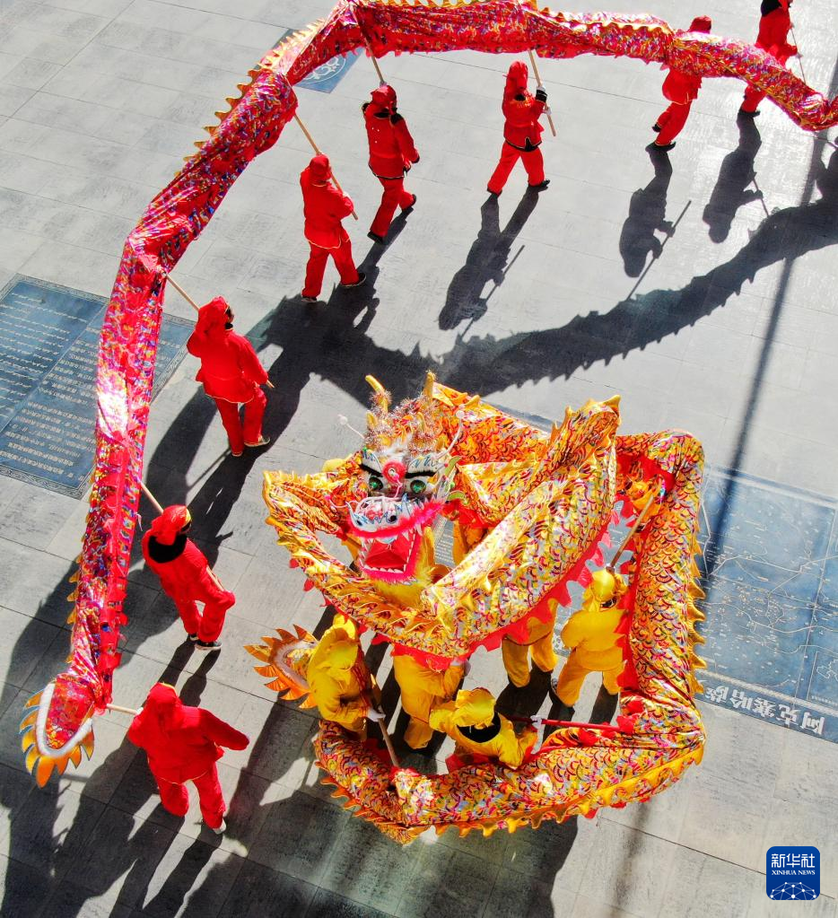 1月31日,艺人在湖南省衡阳市珠晖区东风街道前进里社区表演舞龙(无人机照片)。