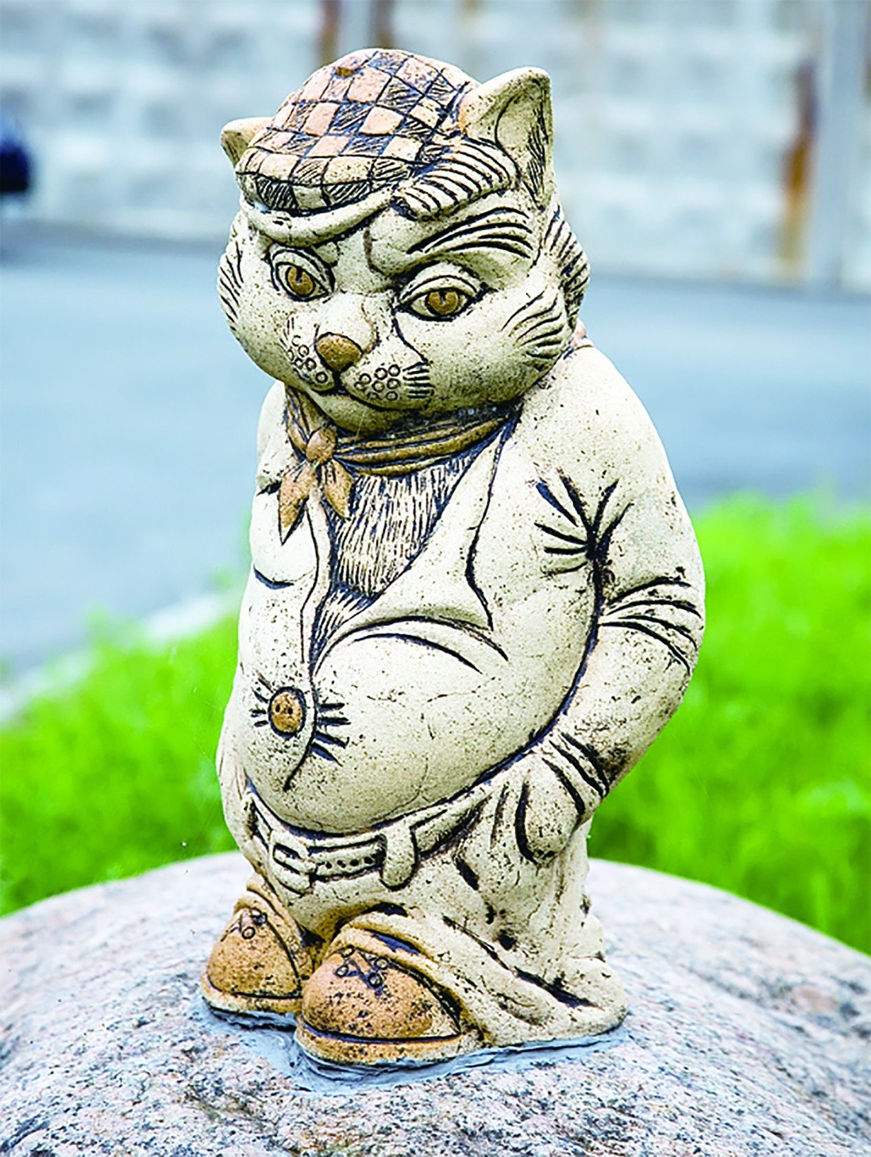 在马来亚萨多瓦亚街边的楼顶屋檐上,还有一对有名的“许愿猫”雕像,这一雌一雄两只猫的雕像记载了这座城市的一段沉重历史。二战期间,泛滥的老鼠引发的传染病肆虐,人们不得不从西伯利亚等地引进猫,将这座城市从严重鼠患中解救出来。在另一条大街马拉塔街上,也有一只“行走”在屋檐上身穿蓝白条纹衫的猫雕像,它被称为“艺术猫”,名叫米特基,正是当地一家艺术团体的名字,这一雕像就是向艺术家们致敬的。在圣彼得堡的卡诺涅尔斯基岛(意为“猫岛”),还有一座标志性的“艺术家猫”雕像,这只猫头戴方格鸭舌帽,围着丝巾,表情忧郁,双手插在裤兜里,典型一位酷酷的艺术家形象(如图)。
