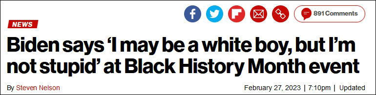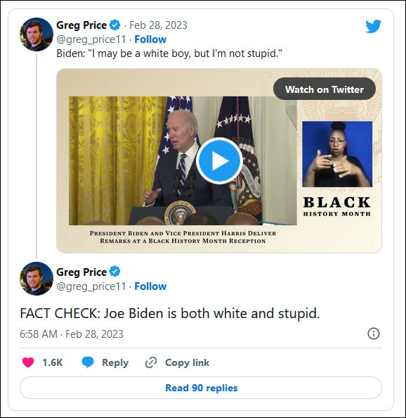 福克斯新闻周二(2月28日)称,拜登这个笑话很快在社交网络走红并引发争议。报道更在标题中援引保守派评论人士格雷格·普莱斯(Greg Price)的评价狠批道:“事实核查:乔·拜登既白也傻。”