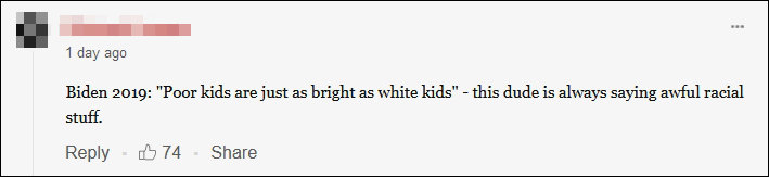 有网友表示,“拜登在2019说:穷孩子和白人孩子一样聪明——这家伙总是说可怕的种族主义言论。”