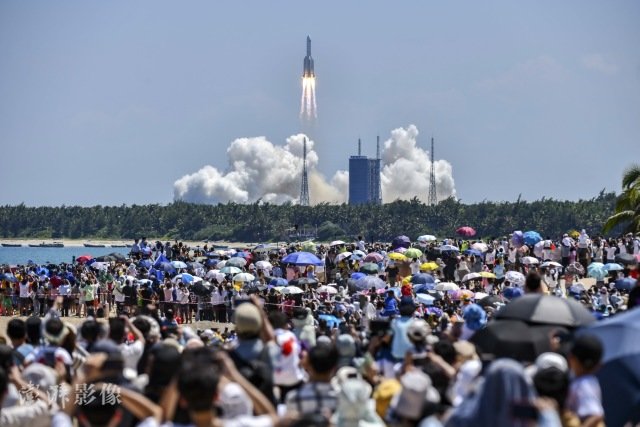 澎湃影像资料图:2022年7月24日14时22分,搭载问天实验舱的长征五号B遥三运载火箭,在中国文昌航天发射场准时点火发射,取得圆满成功。中新社记者 骆云飞 摄