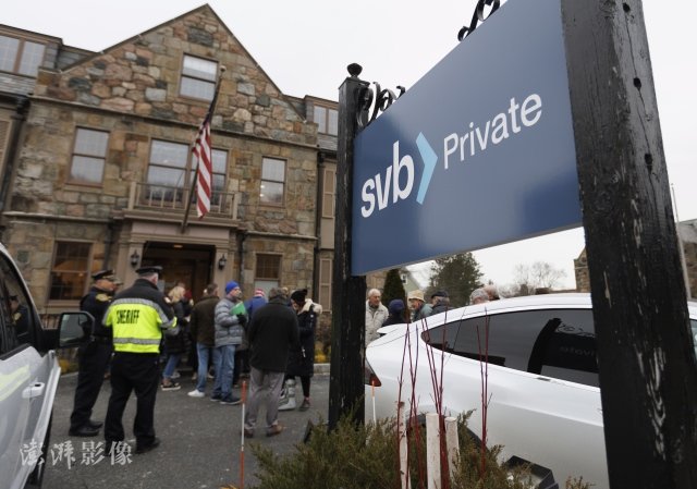 3月13日,美国马萨诸塞州韦尔斯利一家硅谷银行分行迎来大批储户,现场警官维持秩序。图自澎湃影像