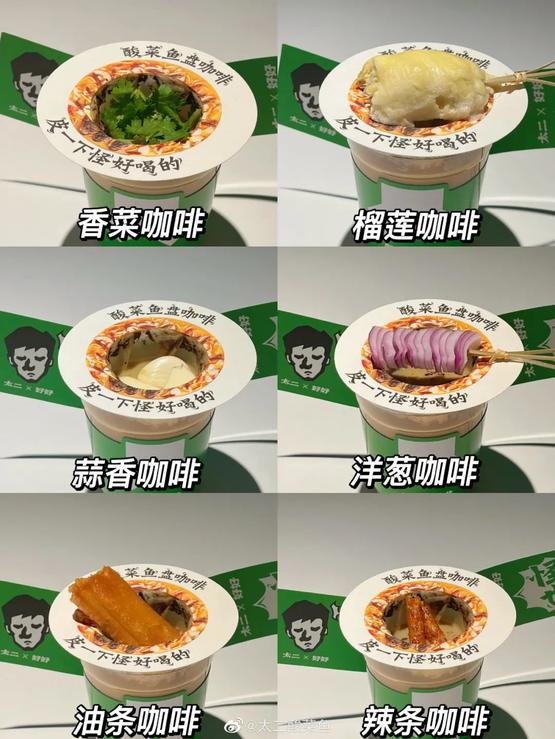 大概是觉得这个套路在网上挺好使,他们在宣传自己的“酸菜鱼盘挂耳咖啡”时,也沿用了这样的套路,自己示范整了什么香菜咖啡、榴莲咖啡、蒜香咖啡……怎么重口怎么整,还号召网友们也来大开脑洞。