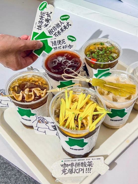 太二酸菜鱼曾与好好咖啡联名推出过“原汁酸菜拿铁”,这名字,一听就酸爽就够味!名义上卖的是咖啡,实际上宣传的还是自己的灵魂酸菜。