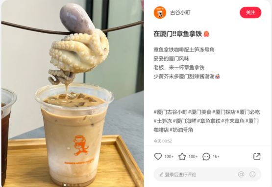 到了厦门,章鱼拿铁,拿铁里可以加入一整个小章鱼本鱼。只能说,尊重,祝福吧……
