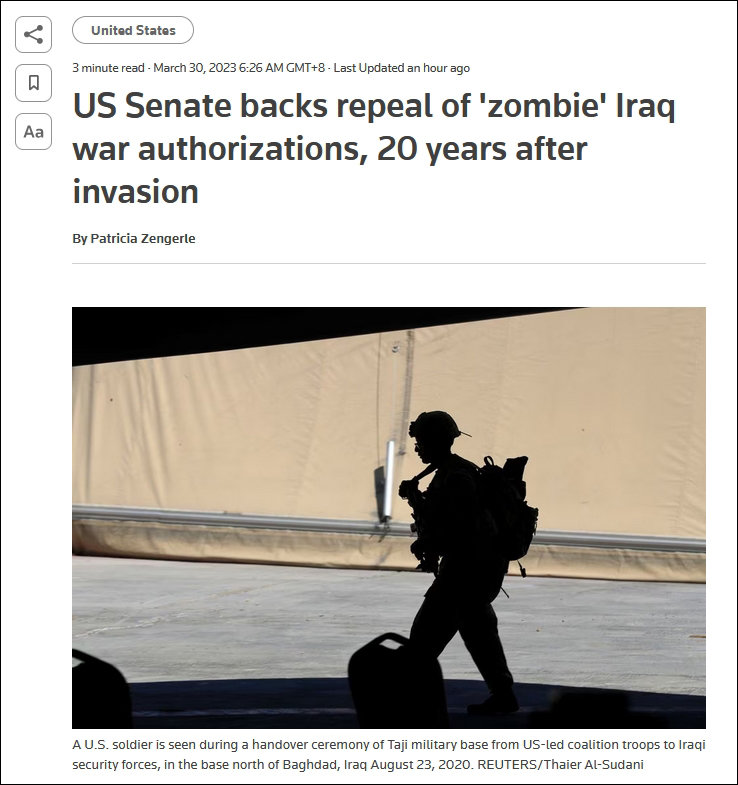 美国入侵伊拉克届满20年之际,美国国会参议院当地时间周三(29日)废除了一项法案,以废除对1991年海湾战争和2002年伊拉克战争的授权。有美媒称,这代表着美国离正式结束这两场战争又近一步,但也有媒体指出此举主要是象征性的。