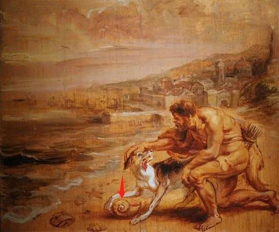 这幅画的名字叫《赫拉克勒斯的狗发现紫色染料》,取材于一个神话传说:有一天,大力神赫拉克勒斯带着他的狗前去向水仙女泰罗示爱,但狗在路过海滩的时候贪玩咬了一个贝壳,贝壳的血把狗嘴染成了紫色。仙女很喜欢这个紫色,要求做一件同样颜色的长袍,从此这种贝壳成为了紫色染料的来源。