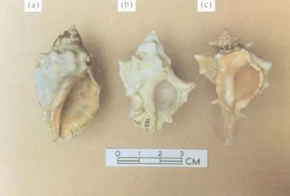 (a)红口岩螺,(c)染料骨螺,(b) 可以制作靛蓝和推罗紫的骨螺Murex trunculus | 参考文献2