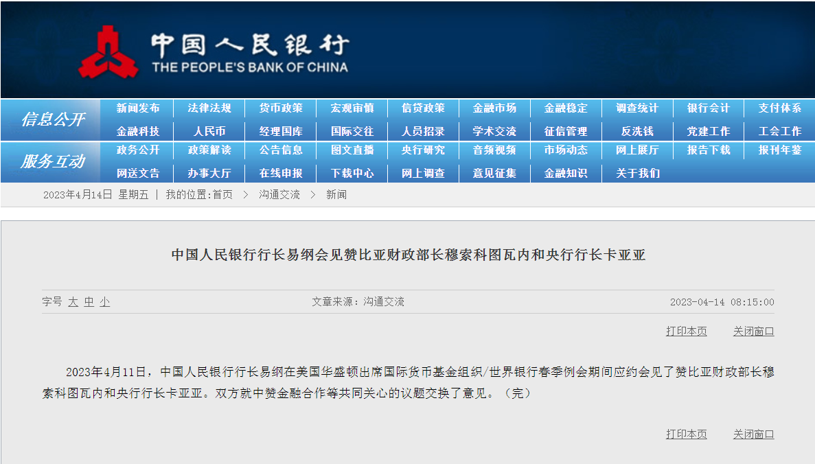 2023年4月11日,中国人民银行行长易纲在美国华盛顿出席国际货币基金组织/世界银行春季例会期间应约会见了赞比亚财政部长穆索科图瓦内和央行行长卡亚亚。双方就中赞金融合作等共同关心的议题交换了意见。
