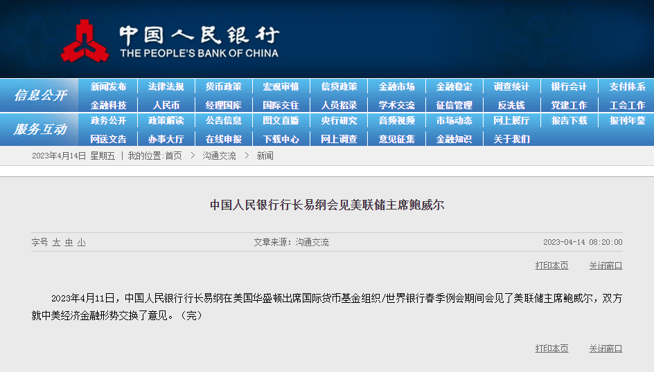 2023年4月11日,中国人民银行行长易纲在美国华盛顿出席国际货币基金组织/世界银行春季例会期间会见了美联储主席鲍威尔,双方就中美经济金融形势交换了意见。