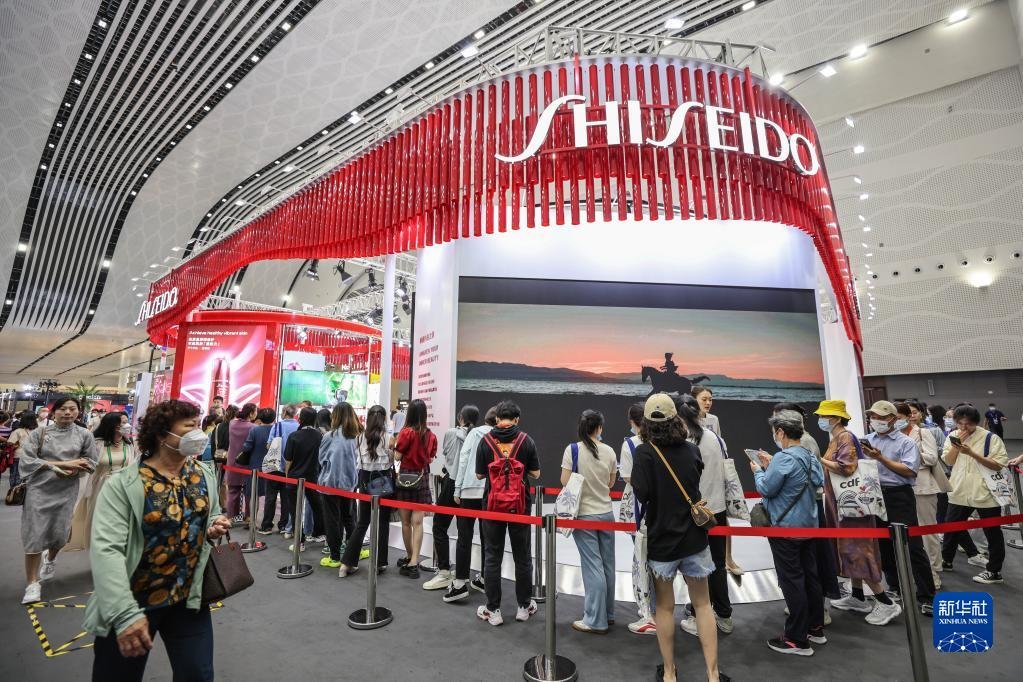 4月13日,观众在消博会资生堂展台排队参加活动。新华社记者 张丽芸 摄