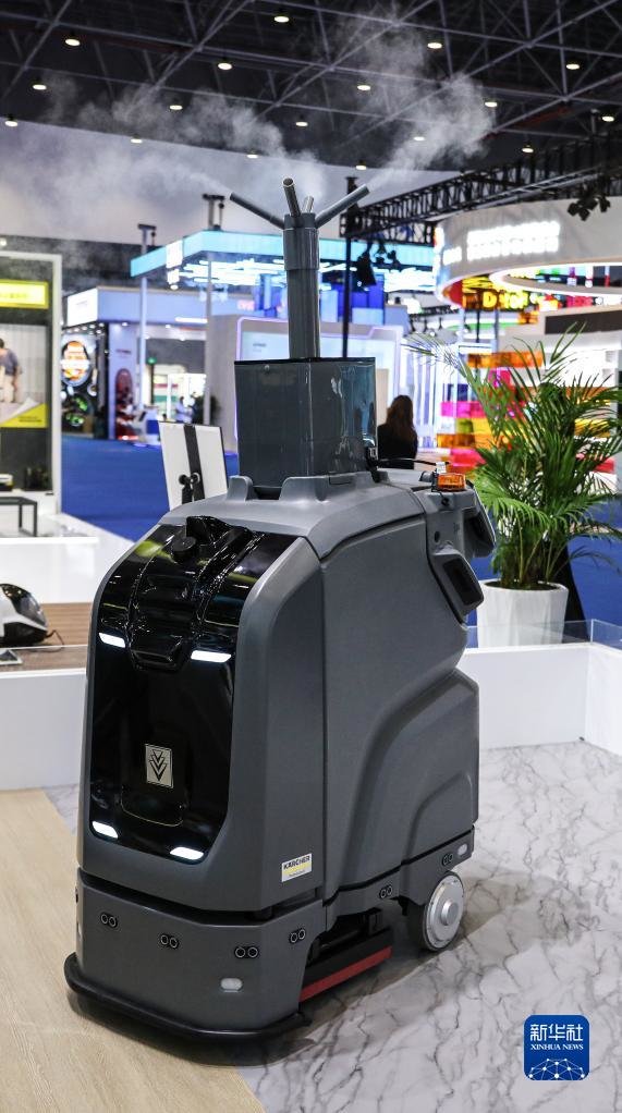 在消博会德国卡赫展台拍摄的AI智能清洁机器人(4月10日摄)。新华社记者 蒲晓旭 摄