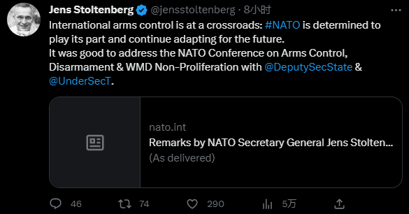 (观察者网讯)一直以来力推军援乌克兰的北约秘书长斯托尔滕贝格,于4月18日在北约会议上发表视频讲话,大谈所谓的“军备控制、裁军和核不扩散”。会上,斯托尔滕贝格污蔑中俄正在“瓦解”军控制度,但随后话锋一转,称为适应一个“更危险、更具竞争性”的世界,北约应在军控问题上与中国接触合作。