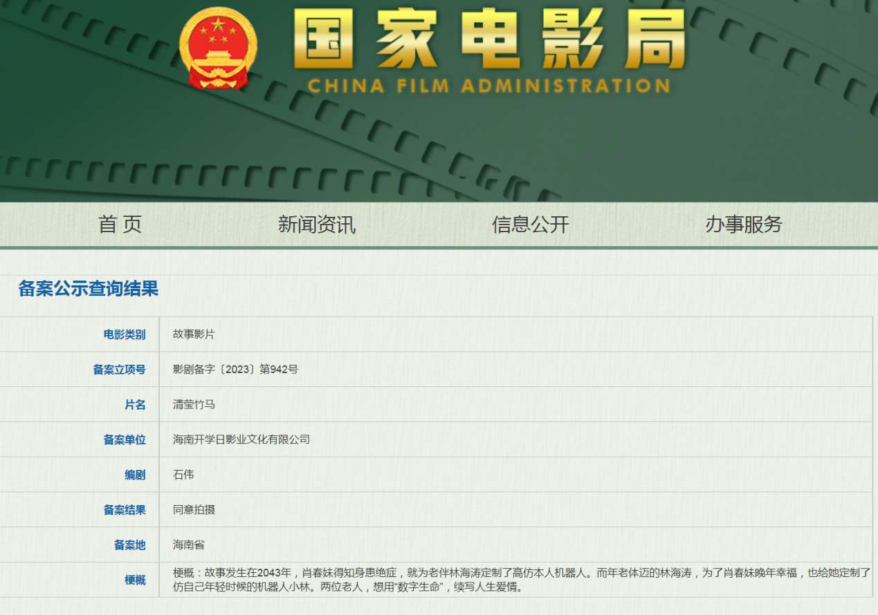AI人工智能的热潮也涌到了电影圈。近日,海南开学日影业文化有限公司的科幻电影《清莹竹马》已获国家电影局立项公示。AI“数字生命”,为甜甜的爱,永恒的爱,衔接出另一片枝叶。