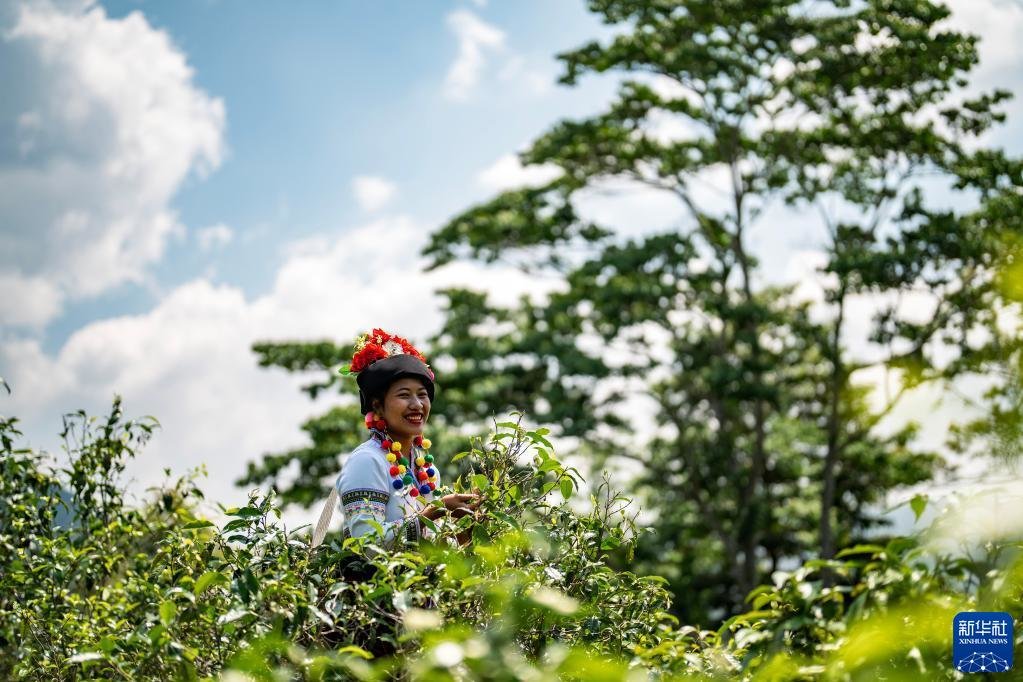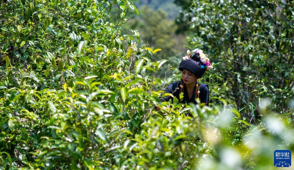 这是2023年5月17日,中国云南省勐海县布朗山布朗族乡老曼峨寨的茶农在采茶。