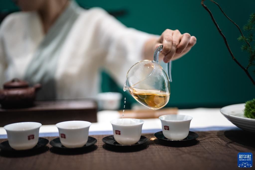 这是2023年5月18日,中国云南省勐海县勐海茶厂的茶道师在展示茶道。