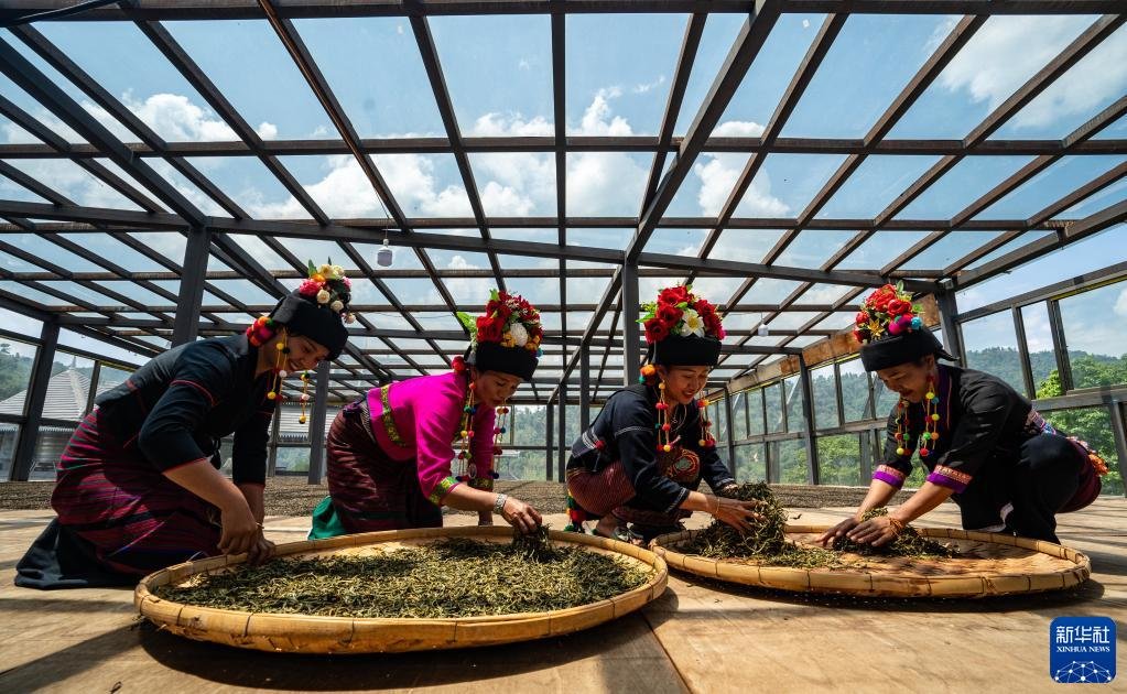 这是2023年5月17日,中国云南省勐海县布朗山布朗族乡的茶农在晾晒茶叶。