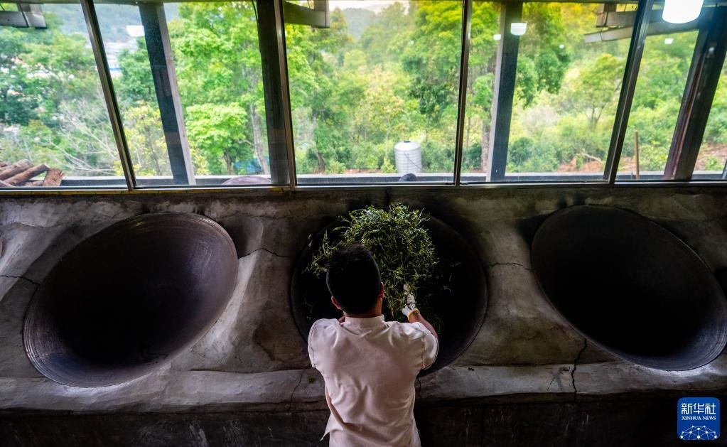 这是2023年5月17日,中国云南省勐海县布朗山布朗族乡的茶农在炒茶。