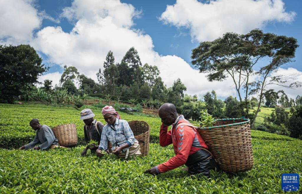 这是2023年5月4日,工人在肯尼亚首都内罗毕附近的茶园采茶。