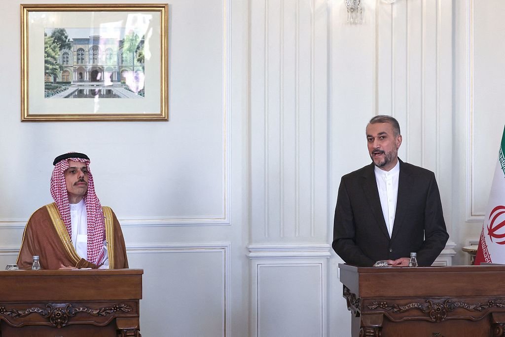 当地时间2023年6月17日,伊朗德黑兰,伊朗外交部长阿卜杜拉希扬(右)与沙特外交大臣费萨尔(左)举行联合新闻发布会。(视觉中国)