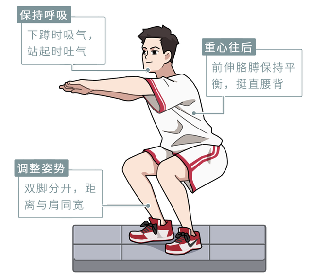 两脚分开与臀部同宽,在双手负荷(哑铃或有水的矿泉水瓶),弯曲膝盖下蹲,然后起立为一次,连续3—4组,每组10—12次。