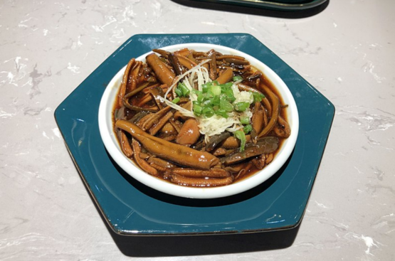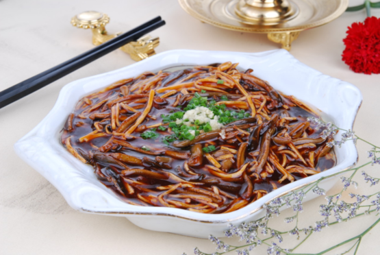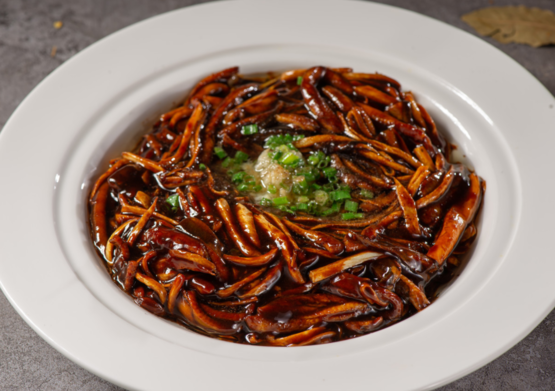 类似的做法,在宁波菜里叫“鳝丝糊剌”,炒好的鳝丝在盘里堆成一座小山,“山顶”留出一个坑形,再将沸腾的香油倒入坑内,鳝丝被浸润得油亮诱人,因此这道菜在宁波又名“鳝油”。