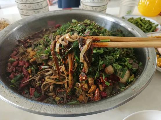 四川乐山的临江鳝丝,也是先将活鳝鱼下入沸水锅里烫熟后,用特制的牛骨刀划出一条条鱼肉丝,当地厨师总结为“三刀划丝”:脊背两刀,肚子一刀。但做法和江浙的响油鳝糊可就不一样了,更接近川菜里的水煮肉片,嫩滑爽口的鳝丝在麻辣锅中烹煮后,裹满鲜香的红油,起锅时撒上一把解腥味的藿香叶子,上桌后,一筷下去满满的鳝鱼丝,就像捞粉丝一样,满足感可想而知。剔掉的鳝鱼骨头也不会被浪费,裹上淀粉后炸得金黄酥脆,隔壁小孩都馋哭了。