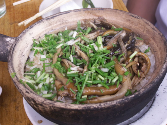 无骨鳝鱼肉好吃,但加工起来仍然有些费时间,因此不少做法干脆省去了剔骨的环节,去头去内脏后切成段烹饪。鳝鱼长期生活在软泥中,自身有一种土腥味,与浓油赤酱或是麻辣重口的调味方式可谓天造地设。淮扬菜里的“大烧马鞍桥”,将鳝段与五花肉块一起红烧,鳝鱼段自然收缩,两头弯曲,形如马鞍,香浓黏稠的汤汁浇在米饭上,油亮喷香。河南信阳的做法却是把五花肉换成了肥瘦相间的腊肉,和鳝鱼一起炖到酥烂,咸香微辣的口味造就了一道米饭杀手(信阳是河南各市里口味最贴近南方的)。