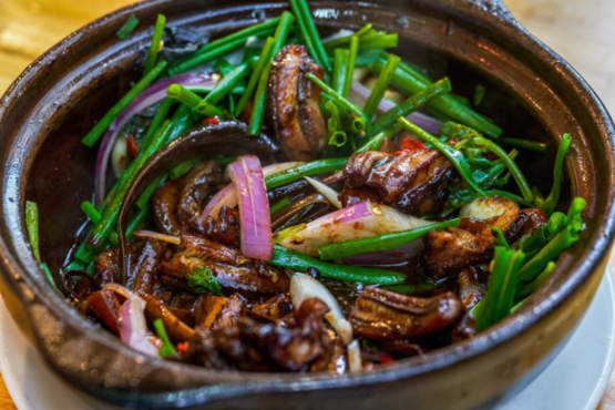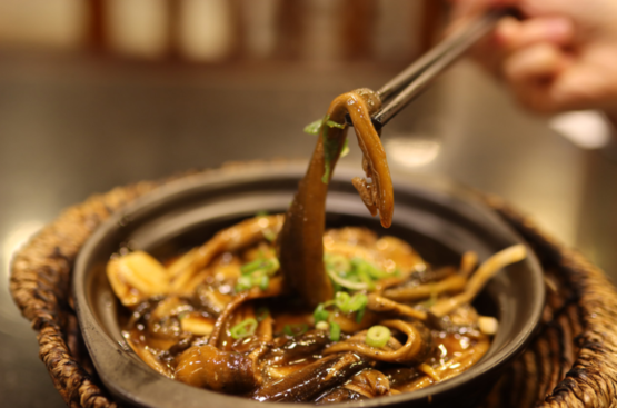 湖北天门被誉为“蒸菜之乡”,当地吃鳝鱼也有特殊的蒸制方式,先将鳝鱼段用调料腌制,再均匀地裹上大米粉蒸熟,出笼后浇上热油和酸辣口味的调料汁,一阵滋滋声过后,就可以大快朵颐。同样伴随着响声上桌的还有广州的啫啫黄鳝煲,将调好味的鳝鱼段和大蒜、葱段、烧腩肉一起放入装有沸腾的油的砂锅,迅速盖上盖子焗几分钟,用猛火逼出鳝鱼的香味,连砂锅一同端上,正是广东人常说的“镬气十足”。