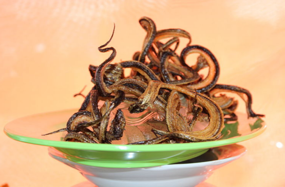 湖北、湖南和四川的“盘龙鳝”比较粗犷,将小鳝鱼吐尽泥沙后,直接下油锅炸到焦黄,一条条鳝鱼在高温下自然弯曲成蚊香状,再加辣椒同烹,酥脆香辣,别有滋味。吃的时候要稍微费点劲,将鱼头连着内脏和脊骨一起拽出来。由于越来越多的人不愿意接受活炸的做法,现在不少饭馆先把鳝鱼用白酒醉死,不去内脏,趁着新鲜下锅炸,也能炸出弯弯曲曲“盘龙”的效果。