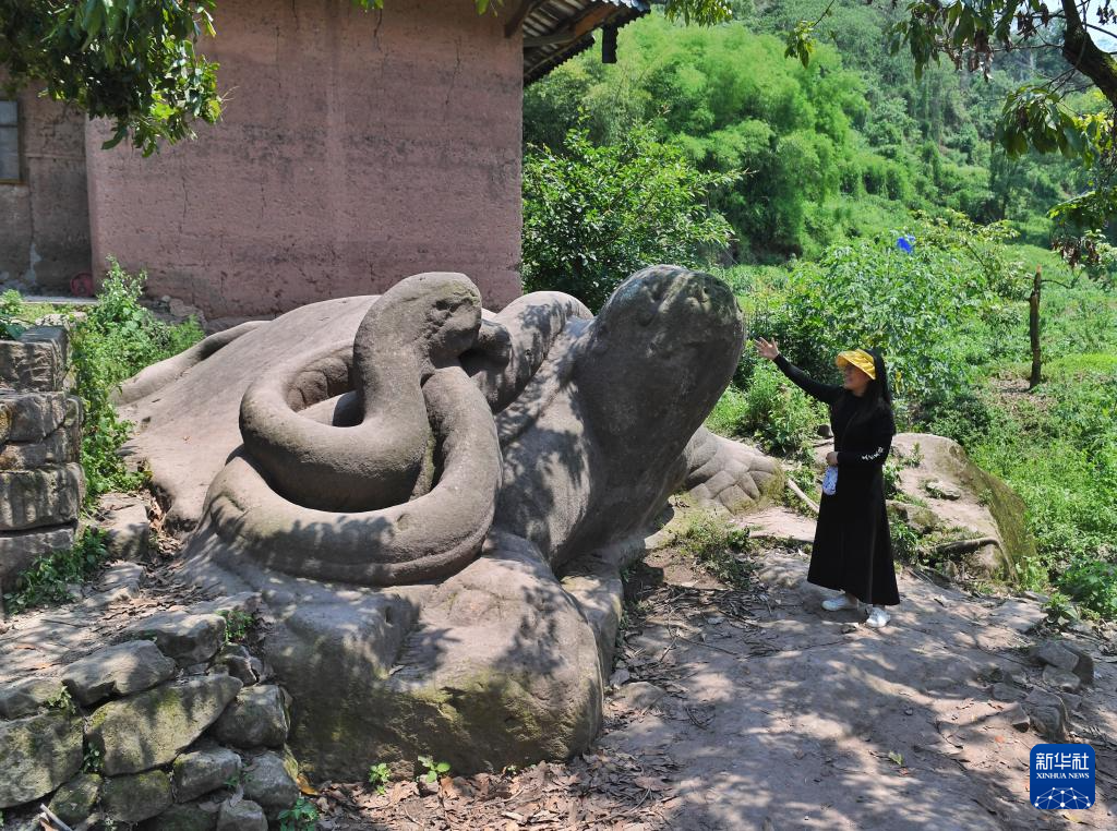 6月27日,当地干部在介绍神臂城内的蛇盘龟玄武石刻。石龟周长20米,背高1.88米,龟背上缠着一条长21.5米的大蟒蛇,用天然整石雕凿而成。