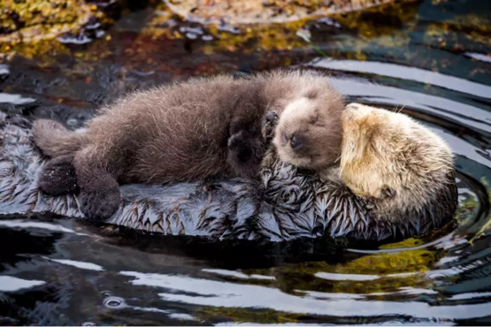 在野外,海獭妈妈和她的幼崽一起休息。(不是841号)| www.montereybayaquarium.org