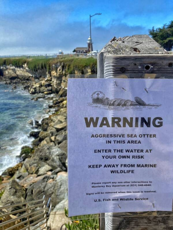 美国鱼类和野生动物管理局已经在海滩贴出警告标志,“该地区有攻击性海獭。进入水中的风险由您自行承担。远离海洋野生动物”| Mark Woodward @NativeSantaCruz