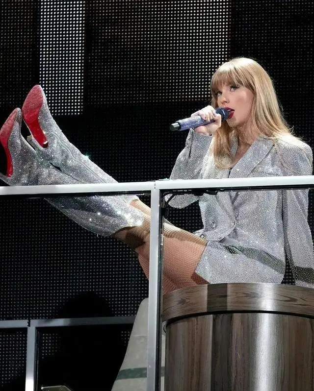 另一套造型Taylor Swift则选择用满钻的西装外套搭配同款长筒靴带来不一样的风格,原本西服外套的克制被闪耀的水钻打破,而带来一种华丽的摇滚风格,脚踩红底长筒靴,展现出大长腿的同时又凸显出她迷人又烂漫的一面。