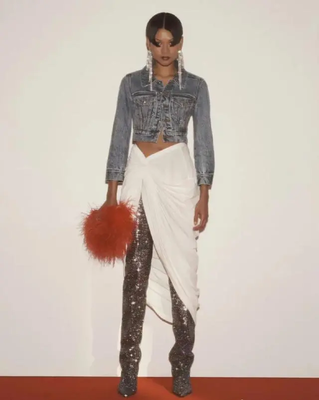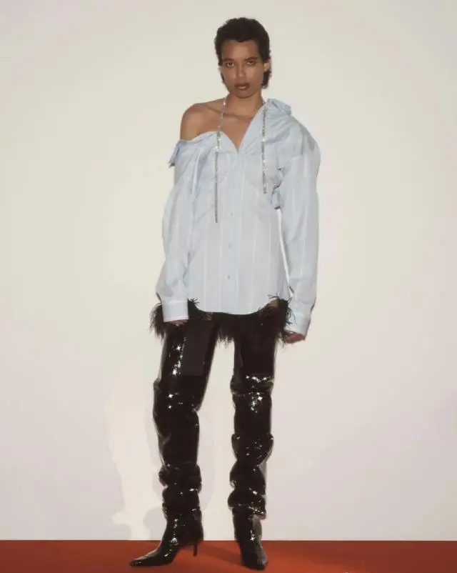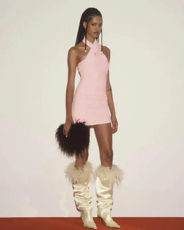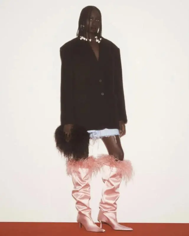 Alexander Wang 2023早春则意在为我们描绘一个潇洒不羁的派对女郎形象。或是柔软的长筒靴以堆叠、褶皱的形式搭配羽毛元素诠释出长筒靴与众不同的一面,或是镶满水钻的尖头长靴靴筒长至大腿根部性感又凌厉,在一半温柔一半性感的氛围中将女性的多面尽情展现。