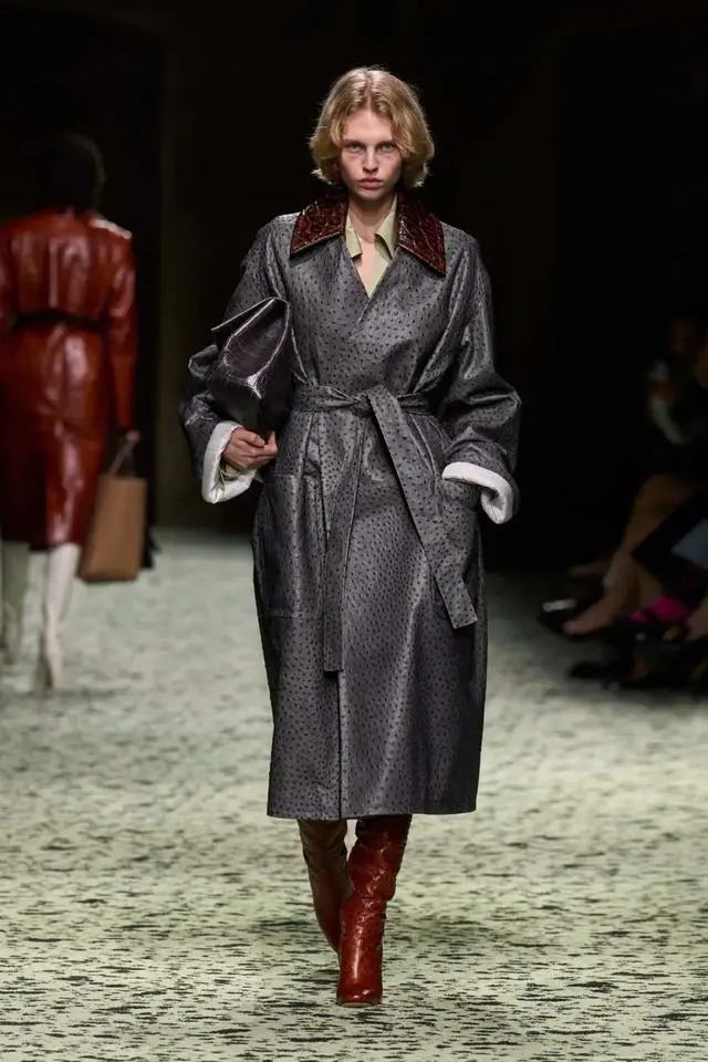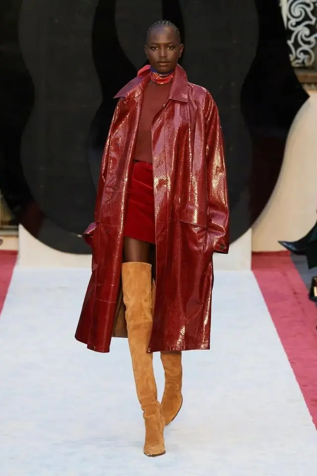 Bally 2023秋冬系列则从“永恒的时间”中汲取灵感,以酒红色、黑色、驼色等厚重的色调搭配皮革、针织等面料呈现出温润、质感的一季。强势的高筒马靴将散落的西装裤收紧,精致的绑带与粗犷的金属扣相组合,将西装的禁欲感与马靴原始的粗砺感相碰撞,展现出现代女性的自信不羁。
