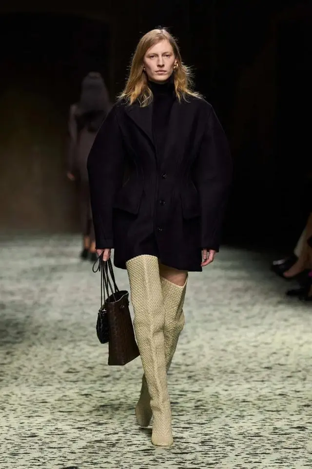 长筒靴回潮的当下,设计师们纷纷在最新系列中用长筒靴搭配华服带来时髦look。Bottega Veneta 2023秋冬系列以“动态的工艺”为创作灵感,将手工编织工艺与皮革融合带来全新的编织长筒靴,细密的编织纹路与考究的皮革工艺在简洁、利落的长筒靴造型下透露着低调、奢华的质感。无论是搭配挺括有型的茧型外套还是线条流畅的皮革套装,都是不错的选择。