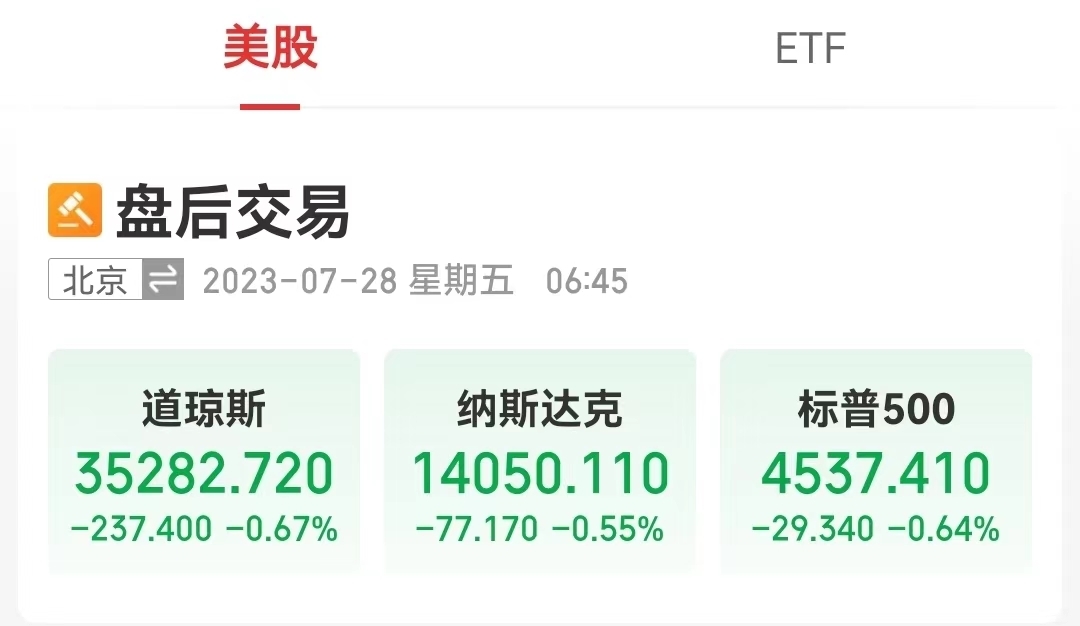 道琼斯指数,收跌237.4点,跌幅0.67%,报35282.72点,标准普尔500指数下跌0.64%至4537.41。与此同时,纳斯达克综合指数下跌0.55%至14050.11。