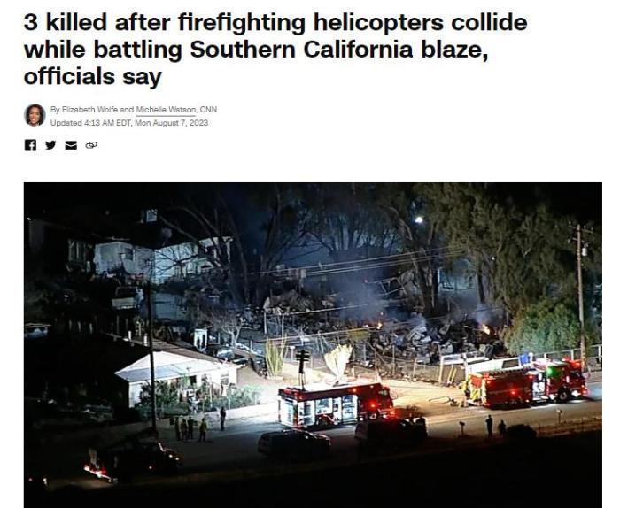 中新网8月7日电 综合美媒报道,美国消防官员表示,当地时间8月6日,一架被派往加州扑灭野火的消防直升机与另一架消防直升机相撞,造成3人死亡。