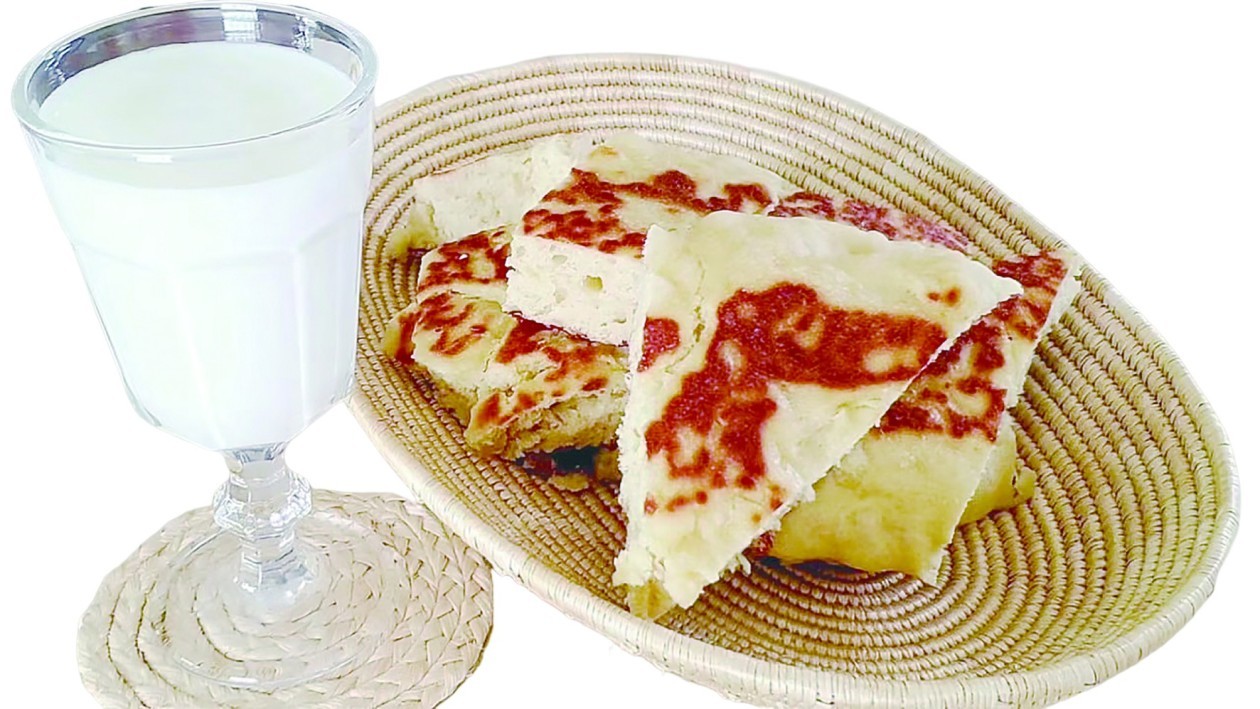 品尝埃塞俄比亚酸奶通常是一个仪式性的过程。当小陶罐端上桌时,人们会拿起一个叫作“因吉拉”的薄饼,来舀取酸奶(如图)。这种饼是埃塞俄比亚餐桌上的主角之一,由一种名为“苔麸”的传统谷物制作而成。因吉拉质地松软而多孔,能够很好地搭配酸奶的口感。
