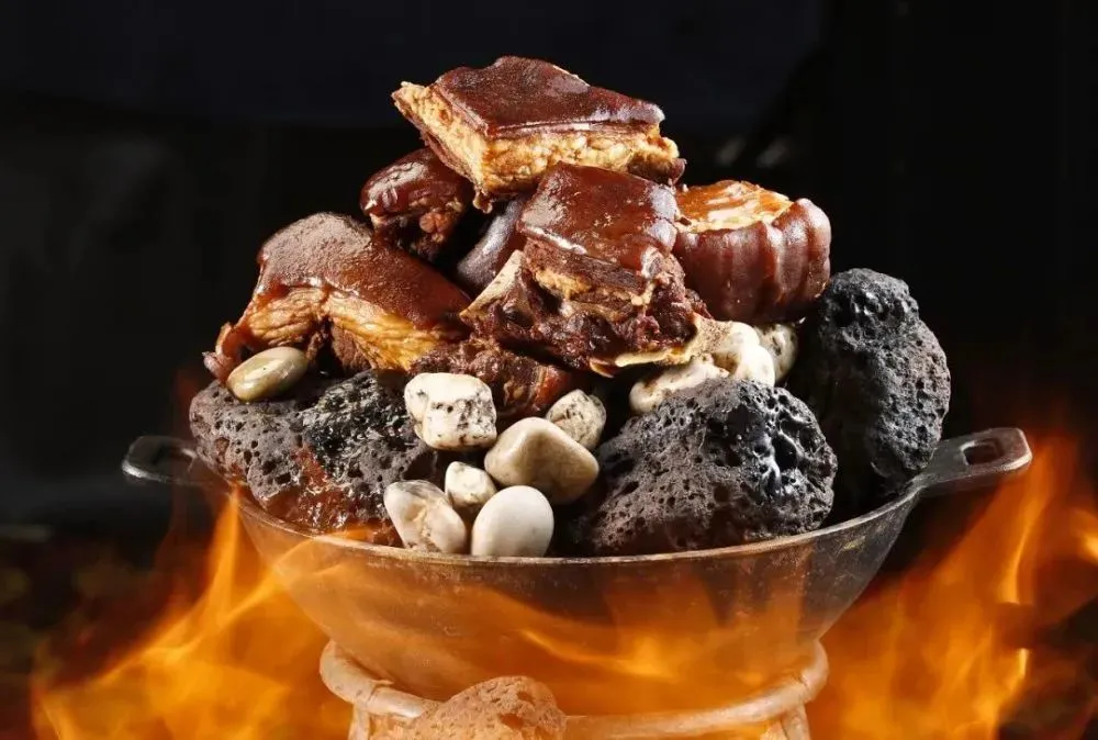 石头烤羊肉是牧民们为了节省燃料得发明,把羊肉平铺在牛奶桶的底部,加上少许盐巴,再放上一层洗干净加热好的石头,最后把奶桶封住来回滚动。羊肉遇到高温石头发出噼噼啪啪声响,呈现出低温慢烤与蒸结合的烹饪。而奶桶的滚动则让羊肉烤得更均匀。在燃料不足的时代,这是获取一份鲜嫩又带着焦香羊肉的,最好方式。