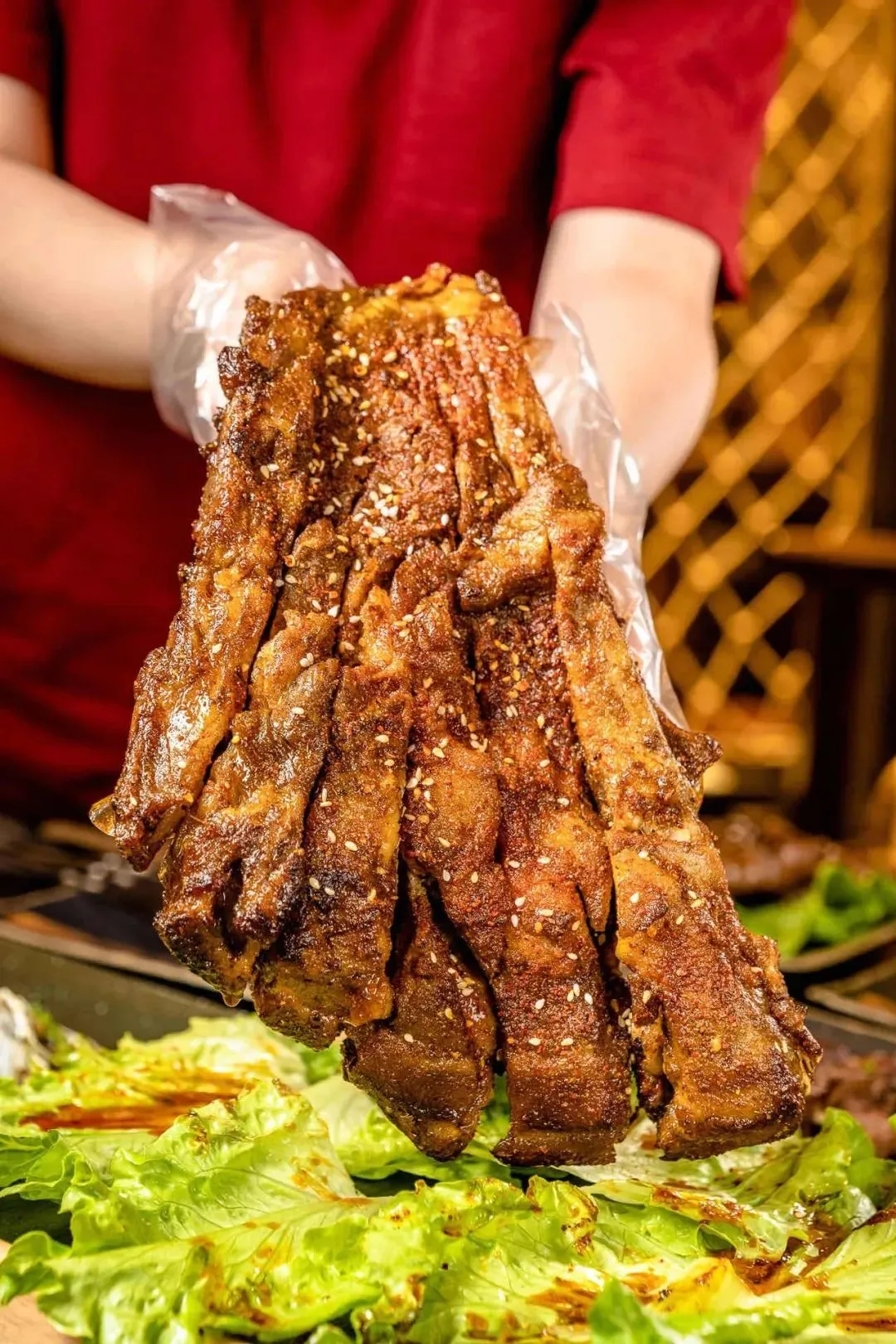 羊腿适合烧烤,绵羊的皮下脂肪丰富,在明火熏燎之下滋滋冒油,而腿腱内部的筋络却充满嚼感,一把孜然辣椒面,把烤羊腿的味道拔升顶点。