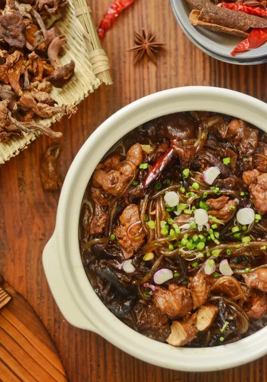 晚餐,则必须来一份小鸡炖蘑菇粉,小鸡来自阿尔山地区农民们的散养土鸡,而蘑菇、榛蘑则是兴安岭山区里的珍品。从饮食形态来看,这是农耕和渔猎混合的,最典型的东北传统食品。