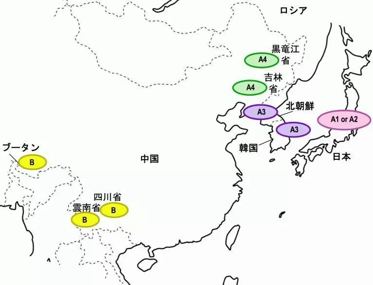 亚洲松茸DNA比较和A种B种分布。via: ffpri.affrc.go.jp