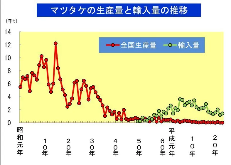 1926-2014年日本松茸产量和进口量的变化。via:pref.ibaraki.jp