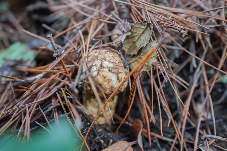 松茸是一种生物特性奇特的真菌,它只能依附松树生长。长达3-5年的土面以下生长周期里,一直需要从松树根系中吸取某种多糖存活。